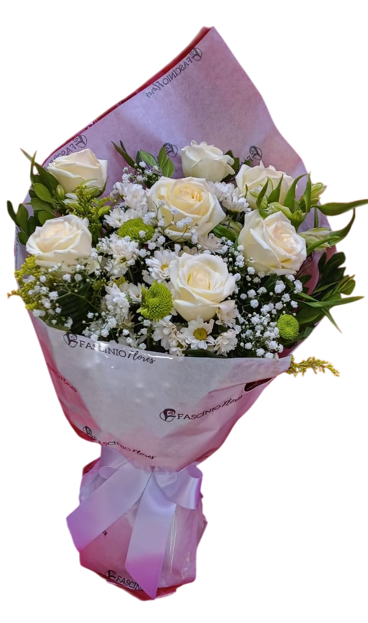 Arranjo floral para presente com 07 rosas brancas, complementos e folhagens numa embalagem linda e moderna.