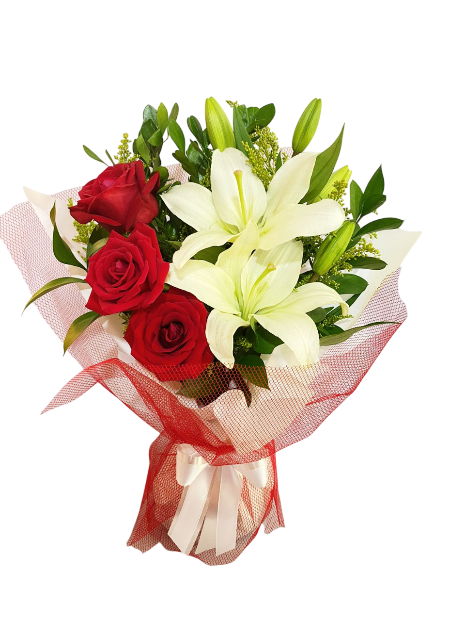 RAMO 1 GALHO DE LÍRIO E 03 ROSAS VERMELHAS